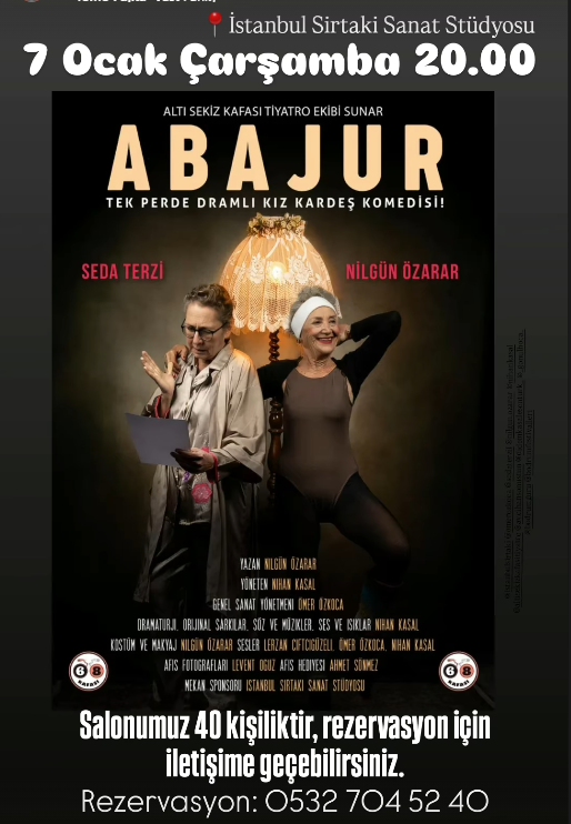 Nilgün Özarar tarafından kaleme alınan ve Nihan Kasal’ın yönetmen koltuğunda oturduğu oyunda; Seda Terzi ve Nilgün Özarar performanslarıyla göz dolduruyor. İki kız kardeşin yaşamından kesitler sunan “Abajur”, hayata dair trajikomik anları sahneye taşıyarak seyirciye duygusal bir yolculuk vadediyor.