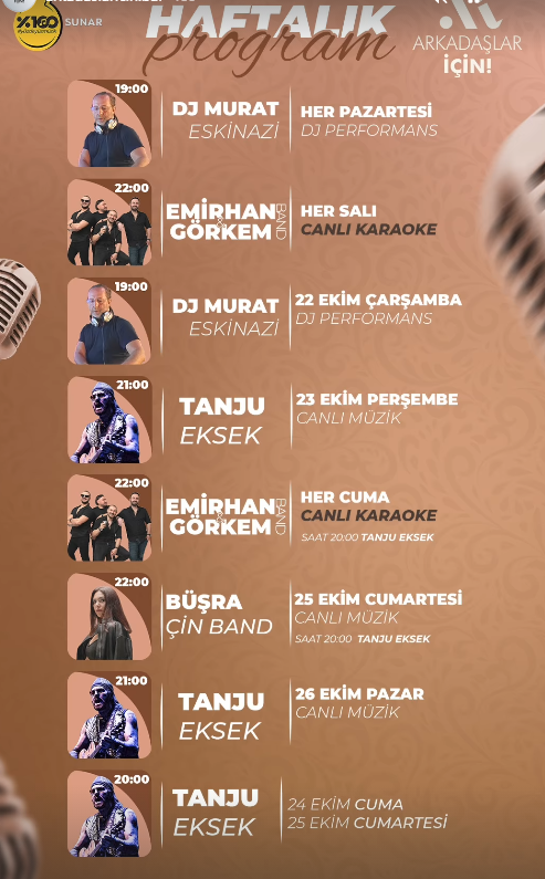 25 Ekim Cumartesi gecesi, saat 21:00’de Büşra Çin Band‘in Canlı Müzik performansı gerçekleşecek. Hafta sonu kapanışı ise 26 Ekim Pazar akşamı saat 21:00’de Tanju Eksek‘in son Canlı Müzik performansı ile yapılacak.