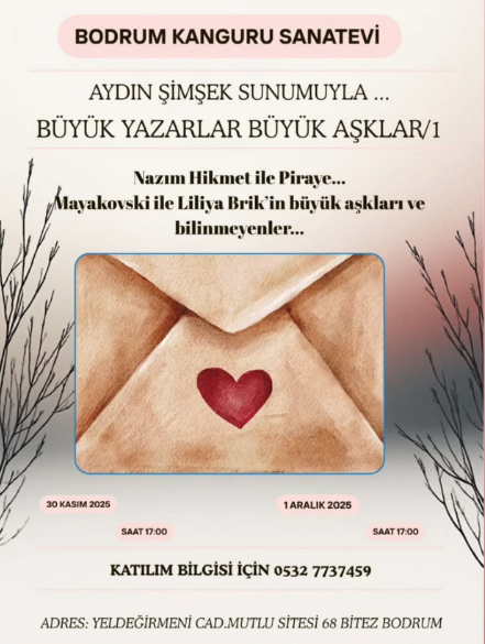 Bodrum Kanguru Sanatevi, edebiyat ve aşkın derinliklerine inen çarpıcı bir etkinliğe ev sahipliği yapıyor. Aydın Şimşek‘in sunumuyla gerçekleşecek olan “Büyük Yazarlar Büyük Aşklar/1”, edebiyat tarihinin en unutulmaz ilişkilerini mercek altına alıyor.