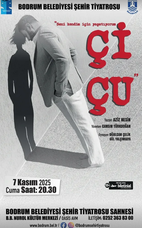 “Çiçu” oyunu, 7 Kasım Cuma günü saat 20:30’da Bodrum Belediyesi Şehir Tiyatrosu Sahnesi’nde, yani B.B. Nurol Kültür Merkezi / Oasis AVM’de perdelerini açacak.