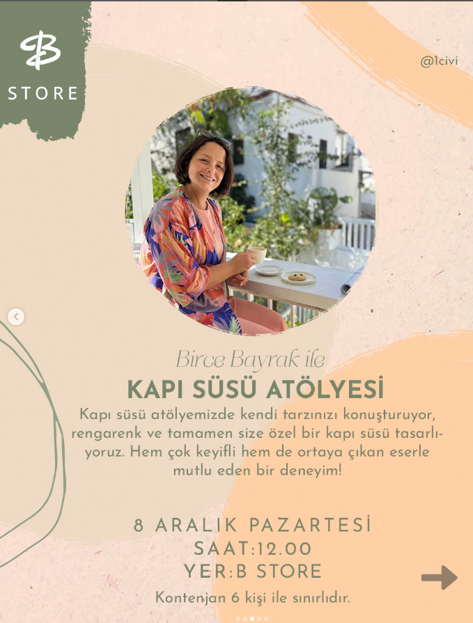 Bodrum’un sevilen mekânlarından B Store, 8 Aralık Pazartesi günü eşsiz bir sanatsal etkinliğe ev sahipliği yapacak. Saat 12:00‘de başlayacak olan Birce Bayrak ile Kapı Süsü Atölyesi, katılımcılara rengarenk malzemelerle tamamen kişiye özel kapı süsleri tasarlama fırsatı sunacak.