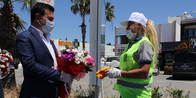Anneler günü dolayısıyla Ortakent ve Turgutreis Mahallesinde annelere kırmızı karanfil vererek günlerini kutlayan Başkan Aras belediyenin kadın temizlik çalışanlarını unutmadı.