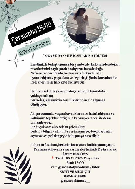 Bodrum’da bütünsel sağlık ve farkındalık arayışında olanlar için özel bir atölye çalışması başlıyor. Sadeto Atölye’nin (@sadeatolye bodrum) ev sahipliği yapacağı “Yoga ve Dans ile İçsel Akış Atölyesi”, katılımcıları nefesin rehberliğinde içsel enerji ve dengeyi keşfetmeye çağırıyor.