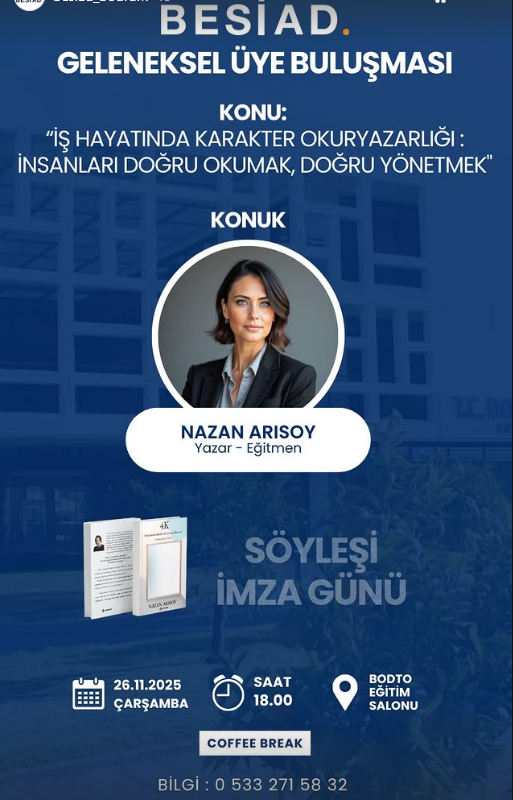 Bodrum Esnaf, Sanayici ve İş İnsanları Derneği (BESİAD), geleneksel üye buluşmalarına iş dünyasının nabzını tutan önemli bir konuyla devam ediyor. 26 Kasım 2025 Salı günü saat 18:00’de Bodrum Ticaret Odası (BODTO) Eğitim Salonu’nda gerçekleşecek etkinlikte, Yazar ve Eğitmen Nazan Arısoy konuk olacak.