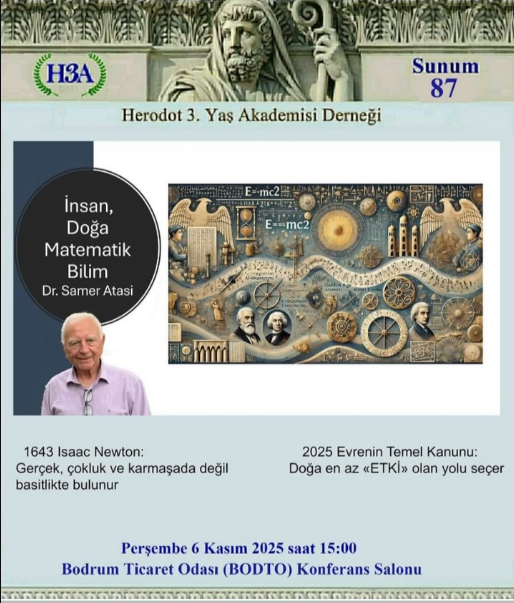 Herodot 3. Yaş Akademisi Derneği (H3A), bilim ve felsefe meraklılarını bir araya getiren önemli bir etkinliğe ev sahipliği yapıyor. Dr. Samer Atasi, derneğin 87. Sunumu kapsamında, evrenin temel yasalarını ve bilimin basitlikle ilişkisini konu alan “İnsan, Doğa, Matematik, Bilim” başlıklı sunumuyla dinleyicilerle buluşacak.