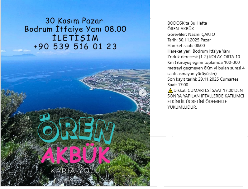 Bodrum Doğa Sporları Kulübü (BODOSK), bu hafta doğa severleri Karia Yolu‘nun eşsiz bir parkuru olan Ören-Akbük güzergâhını keşfetmeye davet ediyor. Zorluk derecesi düşük, manzarası yüksek bu yürüyüş, Pazar sabahı erkenden başlayacak.