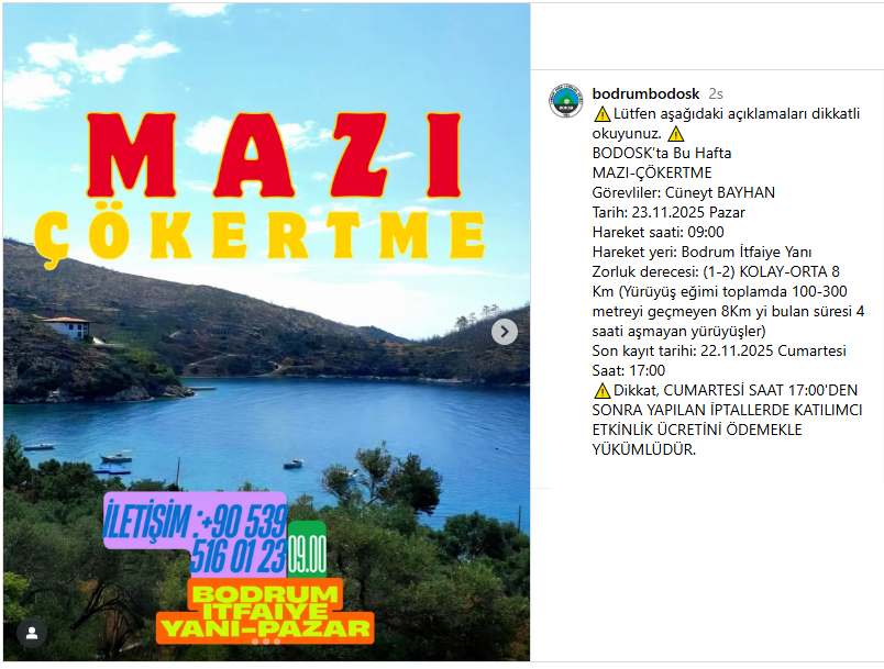Bodrum Doğa Sporları Kulübü (BODOSK), doğaseverleri bu hafta sonu Ege’nin en güzel koylarından biri olan Mazi ve Çökertme rotasına davet ediyor. 23 Kasım 2025 Pazar günü gerçekleşecek olan yürüyüş etkinliği için son kayıtlar 22 Kasım Cumartesi saat 17:00’de sona eriyor. Bodrum doğasını keşfetmek isteyenler bu fırsatı kaçırmasın!