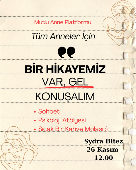 Mutlu Anne Platformu, Bodrum’daki tüm anneleri, deneyimlerini paylaştıkları ve psikolojik destek aldıkları özel bir buluşmaya davet ediyor. “Bir Hikayemiz Var, Gel Konuşalım” başlığı altında gerçekleşecek bu sıcak etkinlik, anneliğin zorluklarını ve güzelliklerini birlikte ele alma fırsatı sunuyor.