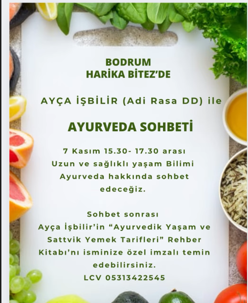 Bodrum’da sağlıklı yaşama ilgi duyanlar için önemli bir etkinlik düzenleniyor. Ayurveda uzmanı Ayça İşbilir (Adi Rasa DD), Bitez’de düzenlenecek özel bir sohbette, binlerce yıllık geçmişe sahip olan ve “Uzun ve Sağlıklı Yaşam Bilimi” olarak bilinen Ayurveda’yı anlatacak.