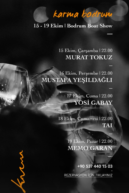 Bodrum’un eğlence hayatının popüler mekanlarından Karma Bodrum, bu yılki Bodrum Boat Show süresince müzikseverlere özel, kesintisiz bir program sunuyor. 15-19 Ekim tarihleri arasında, Boat Show’un hemen yanında yer alan Karma Bodrum, her akşam farklı bir ismi ağırlayarak eğlenceyi zirveye taşıyacak.