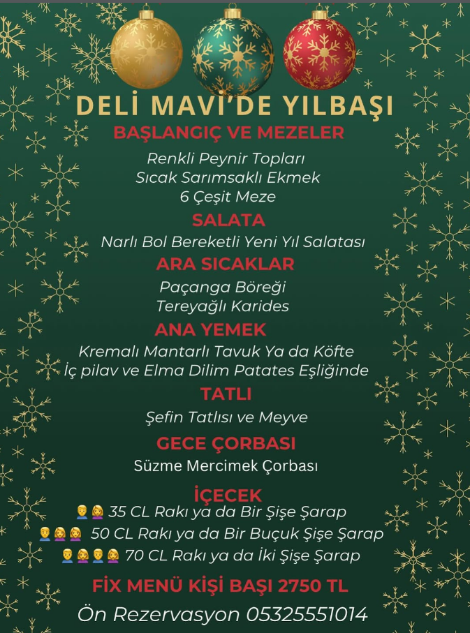 Yeni yılı Deli Mavi’nin sıcak ortamında karşılamanın bedeli kişi başı 2750 TL olarak açıklandı. Sınırlı kontenjan nedeniyle ön rezervasyon yaptırılması büyük önem taşıyor.