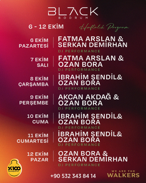 Tatil sezonu sonrası eğlence ritmini düşürmeyen Bodrum’un popüler mekânlarından Black Bodrum, 6-12 Ekim tarihleri arasındaki dolu dolu haftalık programını müzikseverlerle paylaştı.