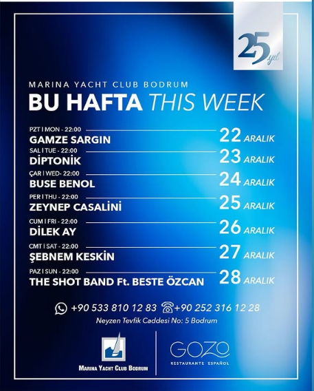 Bodrum’un kalbinde, 25 yıldır eğlence ve lezzetin buluşma noktası olan Marina Yacht Club Bodrum, 22-28 Aralık haftası için heyecan dolu canlı müzik programını duyurdu. Yerli ve yabancı misafirlerin uğrak noktası olan mekanda, bu hafta da birbirinden değerli sanatçılar sahne alacak.
