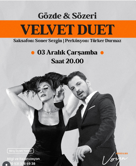 Gözde ve Sözeri‘nin güçlü vokal uyumuyla hayat bulan Velvet Duet, repertuvarlarında yer alan caz klasiklerinden günümüz hitlerine kadar geniş bir yelpazeyi sahneye taşıyor. Grubun müziğine, usta isimler Soner Sezgin‘in saksafon tınıları ve Türker Durmaz‘ın ritmik perküsyonları eşlik ediyor.