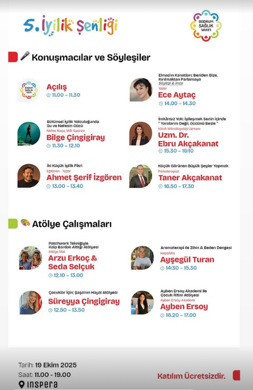 Bodrum Sağlık Vakfı, düzenlediği bu şenlikle kış sezonuna girerken Bodrum halkını “iyilikte buluşmaya” davet ediyor. Alanında uzman konuşmacılar, renkli stantlar ve ücretsiz atölyeler ile 5. İyilik Şenliği, hem ruhsal hem de bedensel iyiliğe odaklanan eşsiz bir deneyim sunuyor.