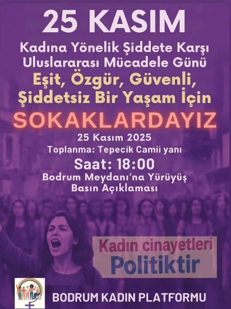 Bodrum Kadın Platformu, 25 Kasım 2025 Pazartesi günü, Kadına Yönelik Şiddete Karşı Uluslararası Mücadele Günü kapsamında bir araya gelmeye hazırlanıyor.