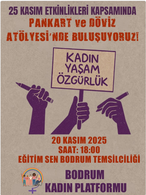 Bodrum Kadın Platformu, 25 Kasım Kadına Yönelik Şiddetle Uluslararası Mücadele Günü etkinlikleri kapsamında, kentteki kadınları bir araya getirecek önemli bir atölye düzenliyor. Şiddete karşı güçlü bir duruş sergilemek ve “Kadın Yaşam Özgürlük” sloganını en gür sesle haykırmak için “Pankart ve Döviz Atölyesi” gerçekleştirilecek.