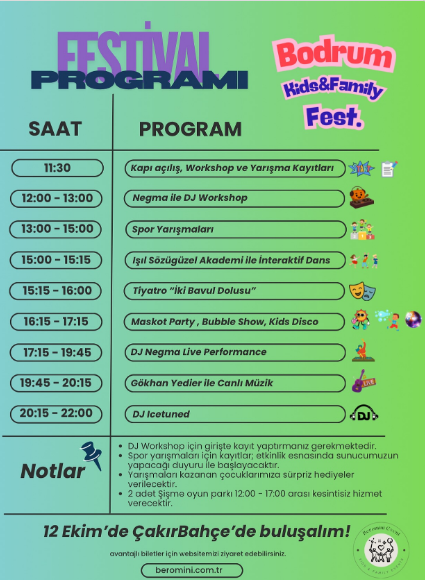 Ailelerin ve çocukların sanattan spora, müzikten tiyatroya geniş bir yelpazede eğleneceği Bodrum Kids&Family Fest, 12 Ekim Pazar günü tüm aileleri ÇakırBahçe’ye davet ediyor.