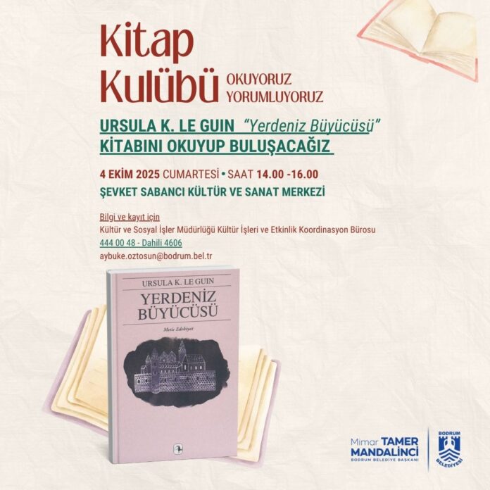 Bodrum Belediyesi’nin düzenlediği Kitap Kulübü etkinliğinde bu hafta, fantastik edebiyatın öncü isimlerinden Ursula K. Le Guin’in ölümsüz eseri “Yerdeniz Büyücüsü” masaya yatırılacak. Okurlar, 4 Ekim Cumartesi günü Şevket Sabancı Kültür ve Sanat Merkezi’nde buluşacak.