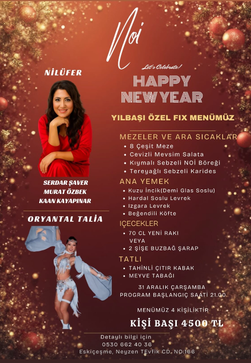 Bodrum’un popüler noktalarından Noi, 2026 yılına görkemli bir gala programıyla merhaba diyor. Nilüfer, Serdar Şaver, Murat Özbek ve Kaan Kayapınar’ın sahne alacağı gecede Oryantal Talia da özel performansıyla yer alacak.