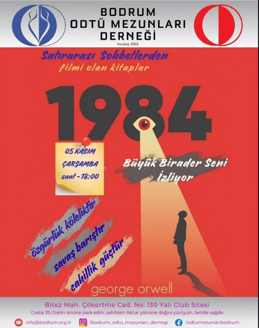 Bodrum ODTÜ Mezunları Derneği, kültür ve sanat etkinliklerine ara vermeden devam ediyor. Dernek, bu kez George Orwell’ın distopik başyapıtı “1984” romanını mercek altına alacağı özel bir söyleşi düzenliyor. Romanın sinemaya uyarlanan versiyonları üzerinden de bir değerlendirme yapılacağı etkinlik, edebiyat ve sinema tutkunlarını bir araya getirecek.