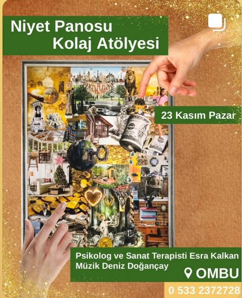 Bodrum’da kişisel gelişim ve sanat terapisi arayanlar dikkat! 23 Kasım 2025 Pazar günü, OMBÜ’de Psikolog ve Sanat Terapisti Esra Kalkan rehberliğinde “Niyet Panosu Kolaj Atölyesi” düzenleniyor. Hayallerinizi somut bir panoya dönüştürmek ve yeni bir yıla bilinçli adımlarla girmek için bu atölyeye katılın!