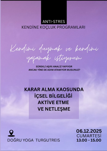 6 Aralık Cumartesi günü Doğru Yoga Turgutreis’te gerçekleşecek olan “Anti-Stres Kendine Koçluk Programı”, sürekli aşırı analiz yapıp adım atmakta zorlananlar için tasarlandı. Katılımcılar, içsel bilgeliği aktive etme ve karar alma kaosundan çıkma yollarını bu özel etkinlikte keşfedecekler.