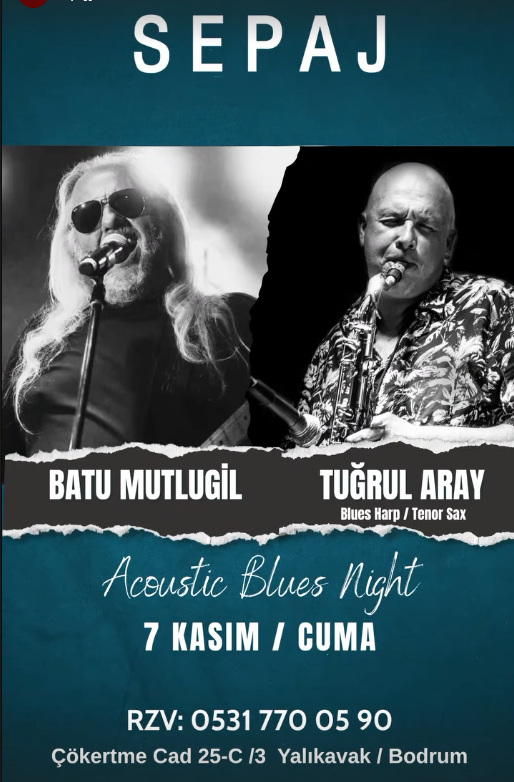 Türk blues müziğinin efsane isimlerinden Batu Mutlugil, Blues Harp/Tenor Sax ustası Tuğrul Aray ile birlikte 7 Kasım Cuma akşamı Sepaj Yalıkavak’ta “Acoustic Blues Night” ile dinleyicilerle buluşuyor.
