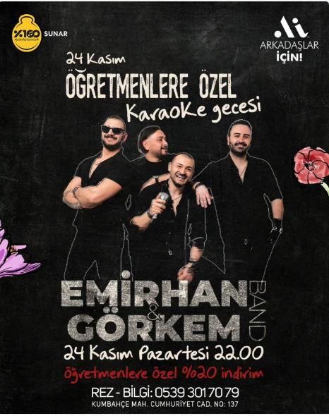 Bodrum’un en hareketli mekânlarından biri, 24 Kasım Öğretmenler Günü‘nü müzik ve eğlenceyle kutlamaya hazırlanıyor. xbodrum’un edindiği bilgiye göre, öğretmenlere özel olarak düzenlenecek bu unutulmaz gecede Emirhan & Görkem Band sahne alacak.