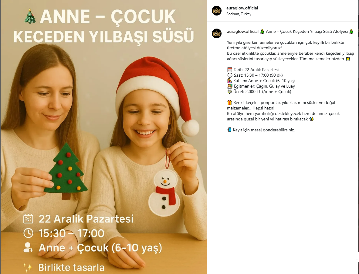 Bodrum’un sevilen etkinlik noktalarından Auraglow, 22 Aralık Pazartesi günü kapılarını anne ve çocuklar için açıyor. “Anne – Çocuk Keçeden Yılbaşı Süsü Atölyesi” ile minikler, anneleriyle birlikte kendi yılbaşı ağacı süslerini tasarlayarak yeni yıl ruhunu yaratıcılıkla karşılayacak.