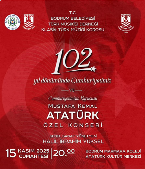 Cumhuriyetimizin kurucusu Gazi Mustafa Kemal Atatürk’ü anma ve Cumhuriyet’in 102. yıl dönümünü kutlama coşkusu Bodrum‘da devam ediyor. Bodrum Belediyesi ve Türk Musikisi Derneği iş birliğiyle, Klasik Türk Müziği’nin eşsiz tınıları eşliğinde duygu dolu bir Atatürk Özel Konseri düzenleniyor.