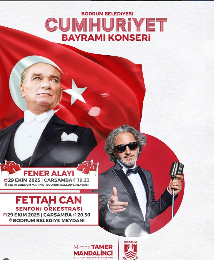 Bodrum Belediyesi, tüm vatandaşları evlerini ve iş yerlerini bayraklarla donatmaya ve akşam gerçekleşecek fener alayı ile Fettah Can ve Senfoni Orkestrası’nın vereceği konsere yoğun katılım göstermeye davet ediyor. Cumhuriyet Bayramı coşkusu, Bodrum’da unutulmaz bir geceye dönüşecek.