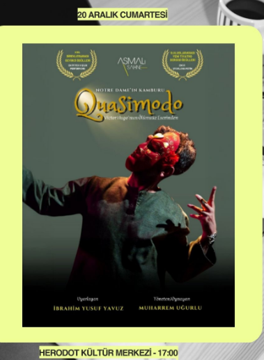Kış sezonunda da kültürel etkinliklerin hız kesmediği Bodrum’da, Herodot Kültür Merkezi prestijli yapımları ağırlamaya devam ediyor. Quasimodo karakterinin içsel dünyasını ve toplumsal adalet temasını derinlemesine işleyen bu performansı kaçırmamak için yerinizi ayırtmayı unutmayın.