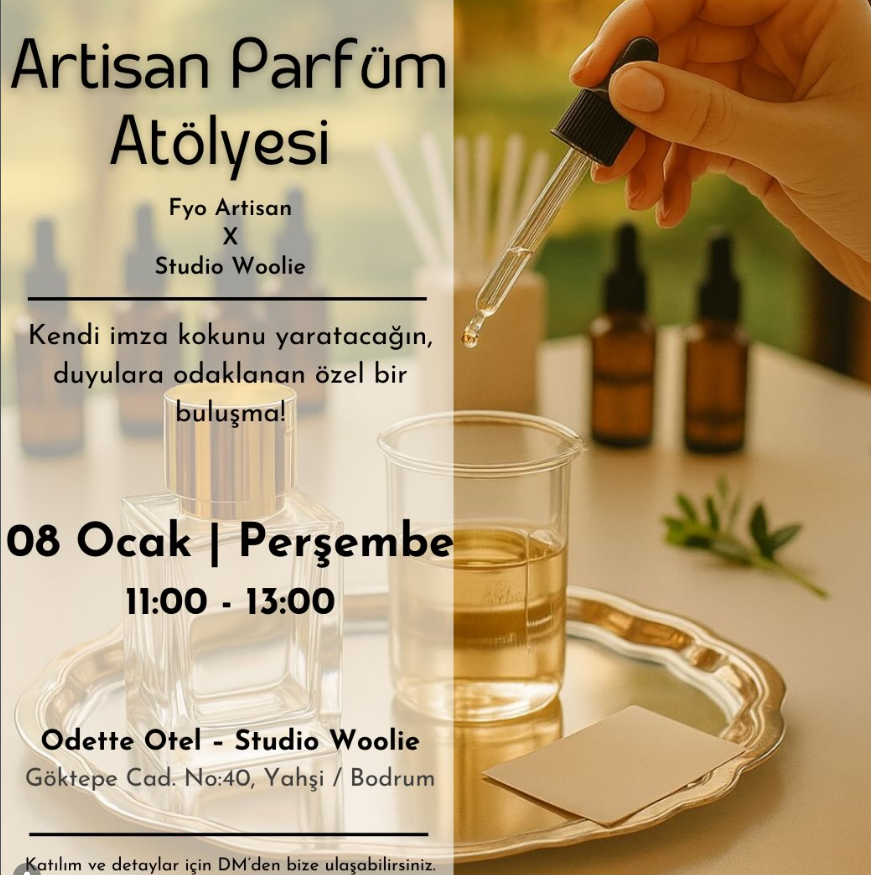 Bodrum’un kültür ve sanat rotasında bu hafta son derece zarif bir buluşma var. 08 Ocak Perşembe günü, Yahşi’nin sevilen noktalarından Odette Otel bünyesindeki Studio Woolie’de düzenlenecek olan atölye çalışması, koku dünyasının kapılarını meraklıları için aralıyor.