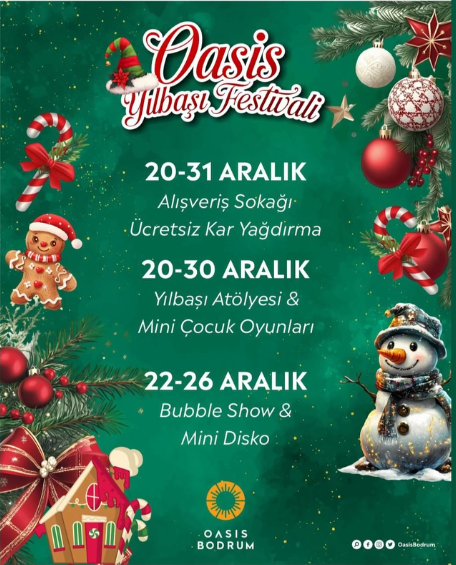 Bodrum’un köklü buluşma noktalarından Oasis Bodrum, 2025 yılını coşkulu bir festivalle uğurluyor. Çocuklara ve yetişkinlere yönelik birbirinden renkli etkinliklerin yer alacağı Oasis Yılbaşı Festivali, Aralık ayı boyunca Bodrumlulara unutulmaz anlar yaşatacak.