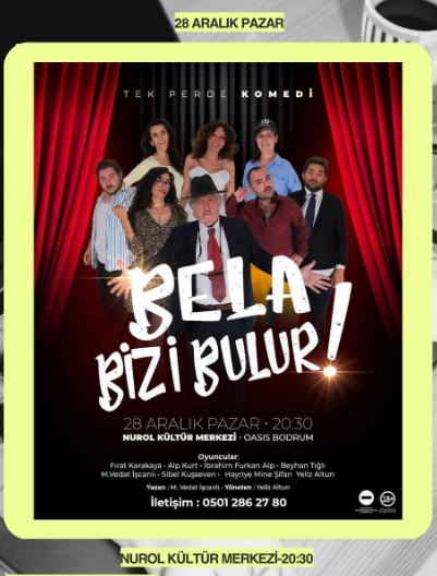 M. Vedat İşcanlı’nın kaleme aldığı ve Yeliz Altun’un yönetmenliğini üstlendiği “Bela Bizi Bulur!”, 28 Aralık Pazar akşamı saat 20:30’da Oasis Bodrum Nurol Kültür Merkezi’nde sahnelenecek. Tek perdeden oluşan bu iddialı komedi, gündelik hayatın içinden çıkan aksilikleri mizahi bir dille ele alıyor.