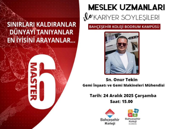 Bahçeşehir Koleji Bodrum Kampüsü, “Meslek Uzmanları ile Kariyer Söyleşileri” kapsamında Gemi İnşaatı ve Gemi Makineleri Mühendisi Onur Tekin’i ağırlıyor. 24 Aralık Çarşamba günü gerçekleşecek etkinlikte, geleceğin mühendis adaylarına sektörün kapıları aralanacak.