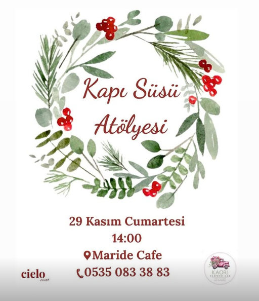 Cielo Event ve Kaori Flower Car iş birliğiyle gerçekleşecek bu etkinlikte, katılımcılar, evin atmosferini değiştirecek, kış temalı çam, kozalak, kırmızı meyveler gibi malzemeler kullanarak kişisel süslerini tasarlayacaklar. Atölye, hem yeni bir hobi edinmek hem de keyifli bir sosyal ortamda zaman geçirmek isteyenler için ideal bir seçenektir.