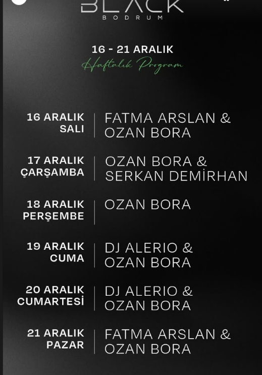 Hafta içi Fatma Arslan ve Serkan Demirhan gibi isimlerle başlayan müzik ziyafeti, hafta sonuna doğru ritmini artırıyor. Özellikle 19 Aralık Cuma ve 20 Aralık Cumartesi geceleri, DJ Alerio’nun set başındaki performansı ve Ozan Bora’nın eşlik edeceği programın, Bodrumlu eğlence severler tarafından yoğun ilgi görmesi bekleniyor.