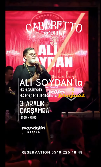 Sahne performansının güçlü ismi Ali Soydan, Türk müziğinin efsaneleşmiş gazino repertuvarını Mandalin Bodrum sahnesine taşıyor. Gecede, unutulmaz Türkçe pop, arabesk ve klasikleşmiş gazino şarkıları seslendirilecek.