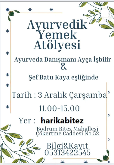 Bodrumlu sağlıklı yaşam tutkunları için benzersiz bir mutfak deneyimi kapıda! Ayurveda Danışmanı Ayça İşbilir ve Şef Batu Kaya eşliğinde, kadim Hint bilimi Ayurveda’nın prensiplerine uygun beslenme ve yemek hazırlama tekniklerinin öğretileceği özel bir atölye düzenleniyor.