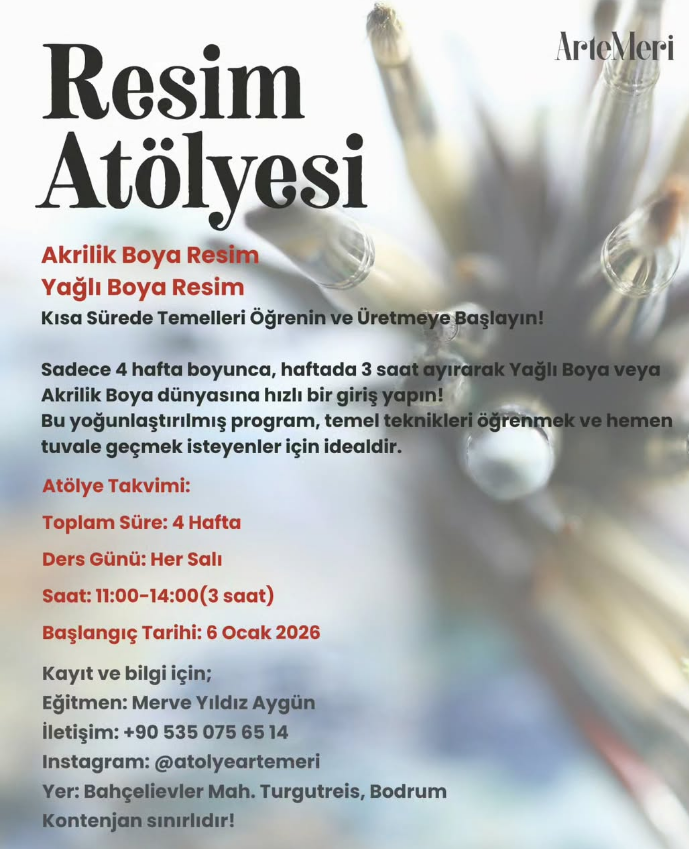 Bodrum Turgutreis’te faaliyet gösteren ArteMeri, yeni yılda sanatla buluşmak isteyenler için yoğunlaştırılmış bir “Resim Atölyesi” programı başlatıyor. 6 Ocak’ta başlayacak eğitimlerle sanatseverler kısa sürede tuvalle buluşacak.