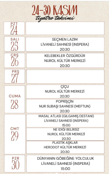Bu hafta Nurol Kültür Merkezi ve Livaneli Sahnesi (Inspera) gibi önemli mekanlarda sahnelenecek oyunlar, sanat dolu bir hafta vadediyor.