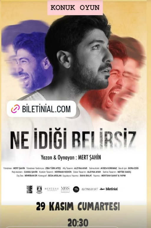 Mert Şahin, hem yazıp hem de oynadığı bu eserde, bireyin iç dünyasındaki çelişkileri, kaybolmuşluk hissini ve günümüz toplumundaki “belirsiz” yaşamları sahneye taşıyor. Görselde de vurgulandığı gibi oyuncunun birden fazla ruh halini yansıtan performansının, izleyicilere yoğun ve düşündürücü bir deneyim yaşatması bekleniyor.