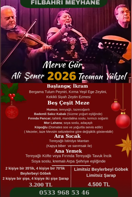 Bodrum’un sevilen mekanlarından Filbahri Meyhane, 2026 yılına özel hazırladığı zengin menüsü ve canlı müzik programıyla konuklarını ağırlamaya hazırlanıyor. Merve Gür, Ali Şener ve Teoman Yüksel’in sahne alacağı gecede lezzet ve eğlence bir arada sunulacak.