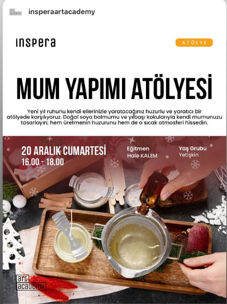 Yeni yıl ruhunu kendi ellerinizle yaratacağınız bu keyifli deneyimi kaçırmamak için Inspera Art Academy ile iletişime geçebilirsiniz.