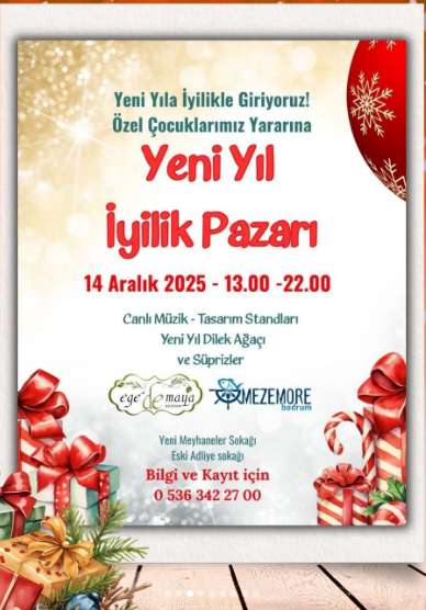 Bodrum’da yeni yıl coşkusu, anlamlı bir sosyal sorumluluk etkinliğiyle birleşiyor! 14 Aralık 2025 Pazar günü, Özel Çocuklar yararına dev bir “Yeni Yıl İyilik Pazarı” kuruluyor. Ege ile Maya ve Mezemore Bodrum iş birliğiyle düzenlenen bu etkinlik, hem keyifli bir alışveriş ve eğlence deneyimi hem de bir sosyal sorumluluk projesi sunuyor.