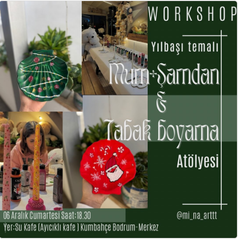 Bodrum Yılbaşı ruhunu el emeği tasarımlarla karşılamaya hazır mısınız? 🎄 06 Aralık Cumartesi günü gerçekleşecek olan Yılbaşı temalı Mum, Şamdan & Tabak Boyama Atölyesi, katılımcılara kendi kişiselleştirilmiş yılbaşı dekorasyonlarını yaratma fırsatı sunuyor. Bu keyifli ve sanatsal etkinlik, Bodrum Merkez’de, Su Kafe (Ayıcıkılı Kafe) ev sahipliğinde gerçekleşecek.