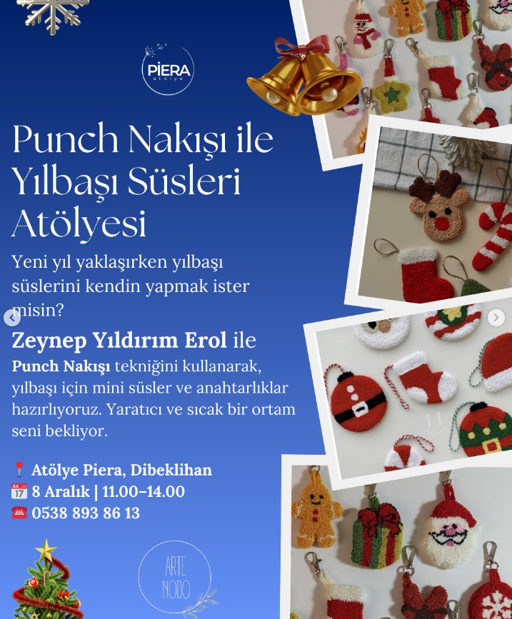 Yeni yıl heyecanı tüm şehri sarmışken, evinizi ve sevdiklerinizi mutlu edecek kişisel dokunuşlar katmanın tam zamanı. Zeynep Yıldırım Erol eşliğinde düzenlenecek olan bu özel atölye, son dönemin popüler el sanatlarından Punch Nakışı tekniğini kullanarak, benzersiz yılbaşı süsleri ve anahtarlıklar yapma fırsatı sunuyor.