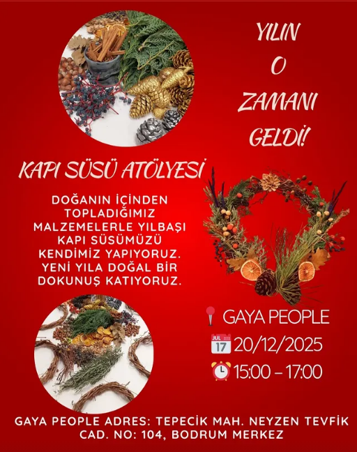Bodrum, yeni yıla doğal ve yaratıcı bir dokunuşla girmeye hazırlanıyor. Gaya People, doğadan toplanan materyallerle gerçekleştirilecek olan “Kapı Süsü Atölyesi” ile sanatseverleri bir araya getiriyor.